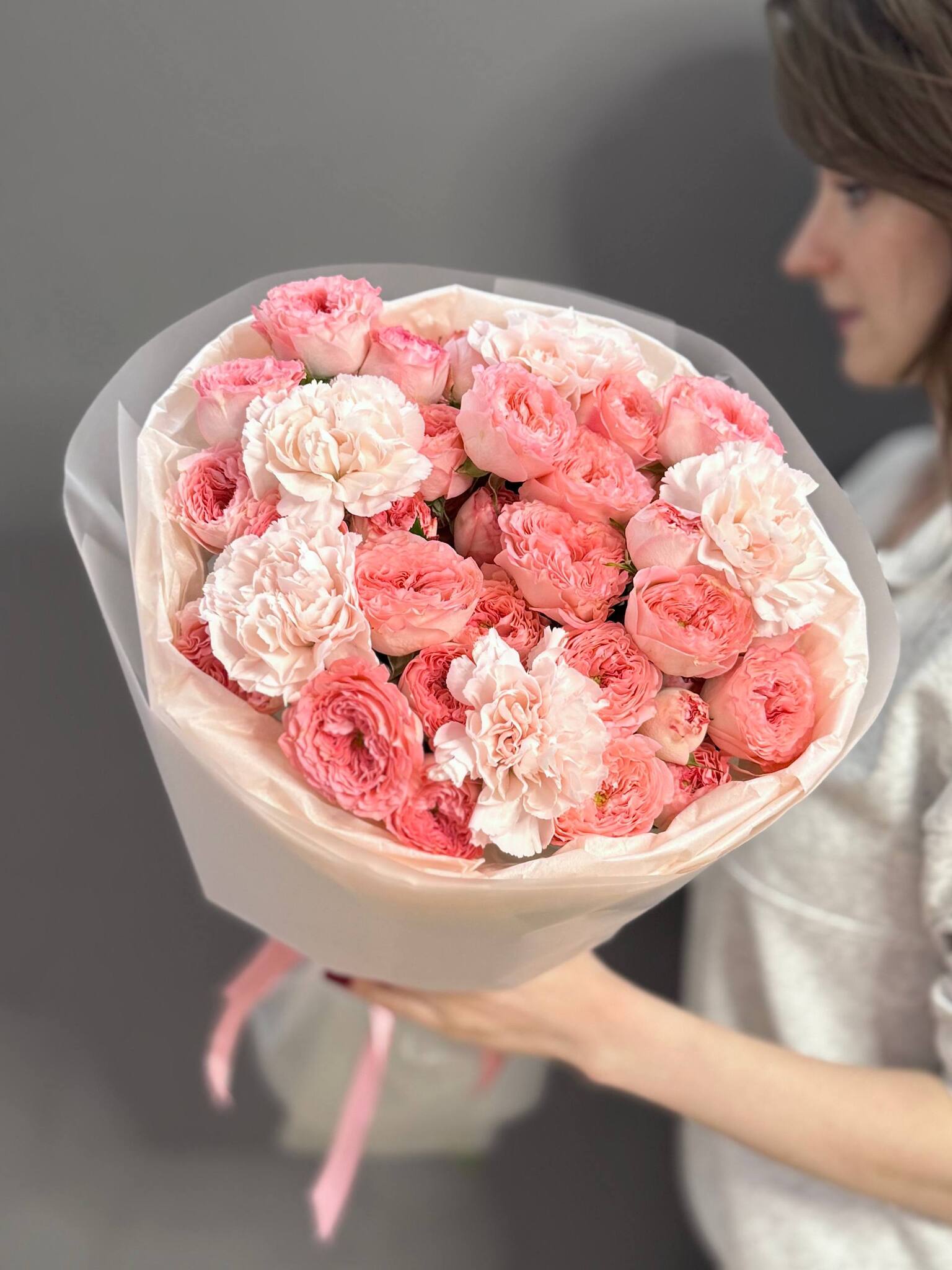 Дуо-букет с кустовыми пионовидными розами и диантусами