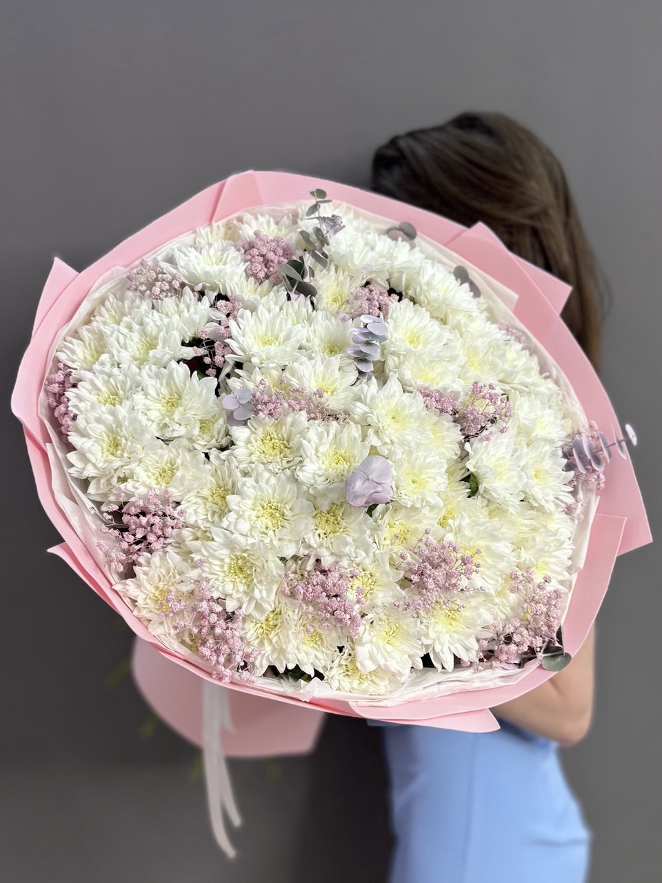 Букет из 15 белых кустовых хризантем сорта "Балтика" с розовой гипсофилой и эвкалиптом