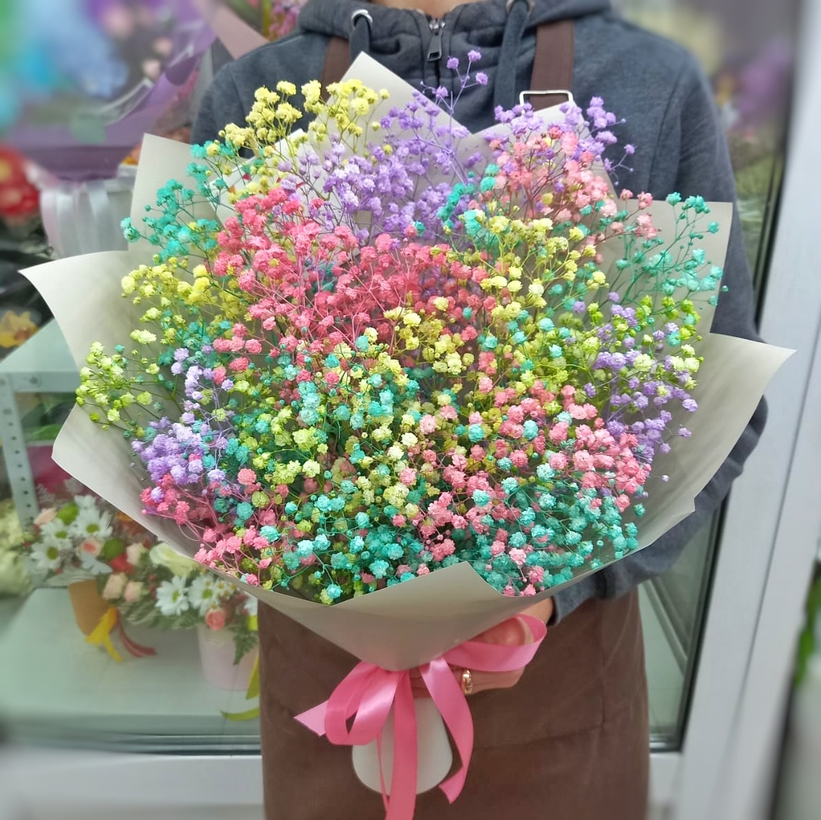 Гипсофила красится индивидуально под Ваш заказ. Если Вы оформили заказ с крашеной гипсофилой с доставкой в этот же день, то гипсофила может иметь запах краски, который в ближайшее время выветрится🤍
