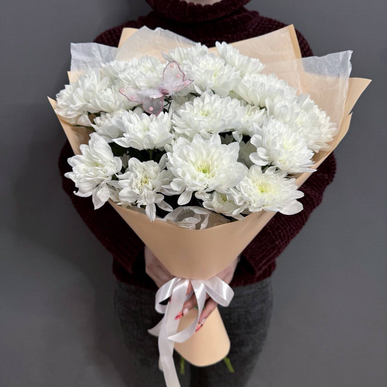 Букет из 5 хризантем сорта "BALTICA WHITE" с бабочкой