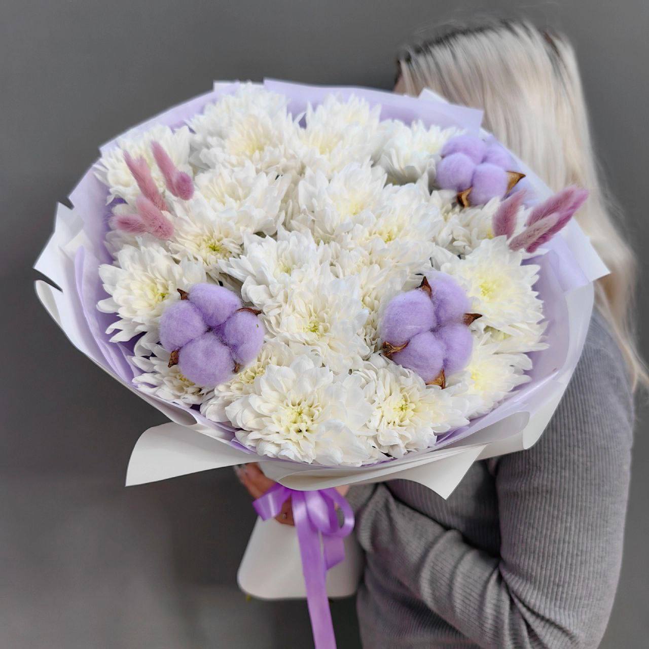 Букет с 5 кустовыми хризантемами и сухоцветами в сиреневой гамме