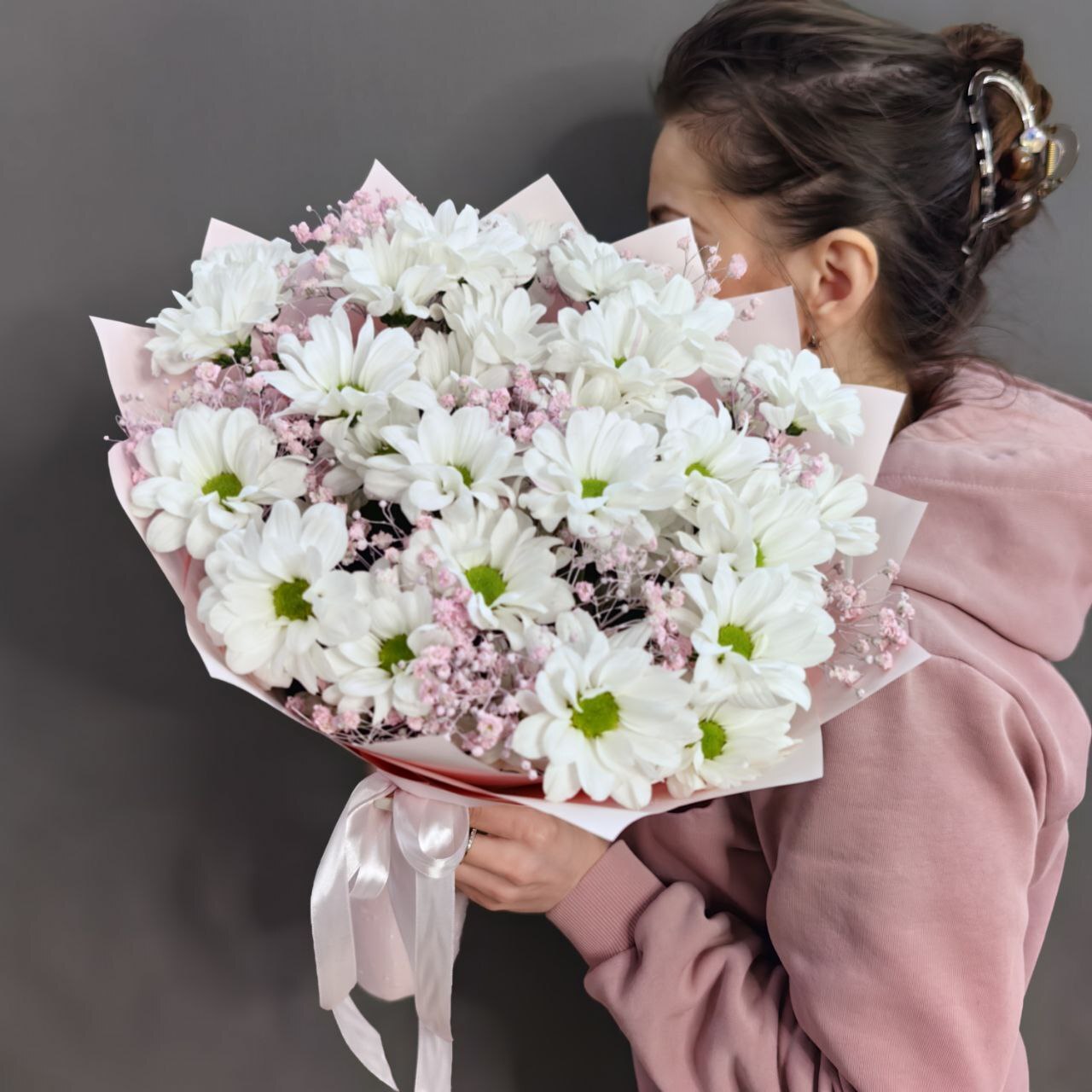 Букет из 5 кустовых хризантем сорта "Kennedy white" и розовой гипсофилы