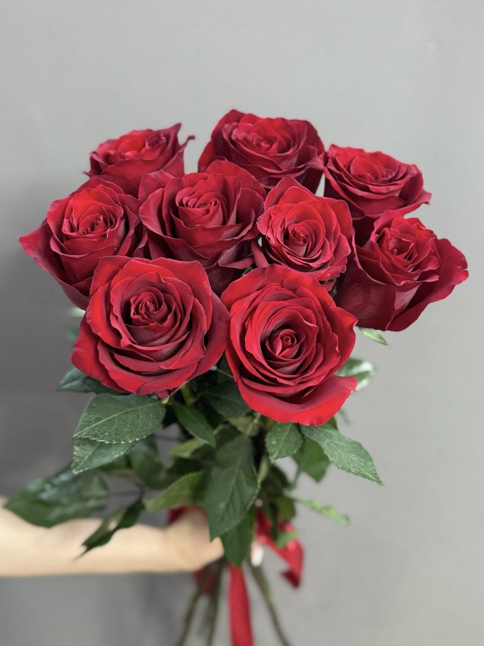 Букет из 9 красных роз сорта "Эксплорер" под ленту (Эквадор 60 см)