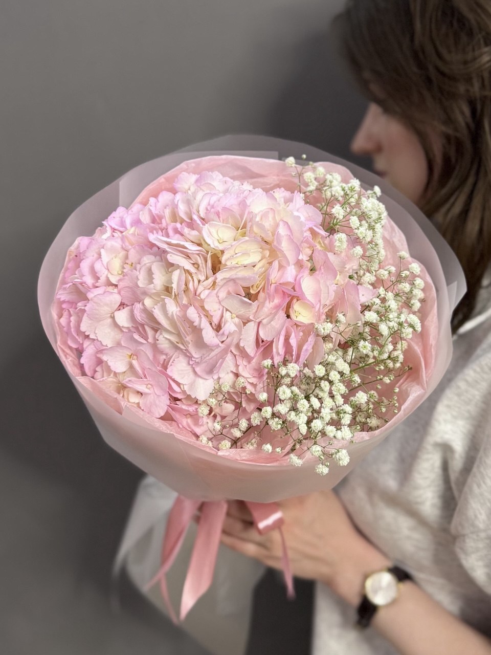Дуо-букет с розовой гортензией и гипсофилой