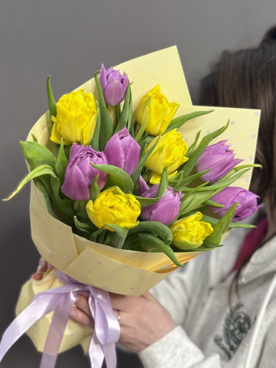 Монобукет из 11 желтых и сиреневых пионовидных тюльпанов
