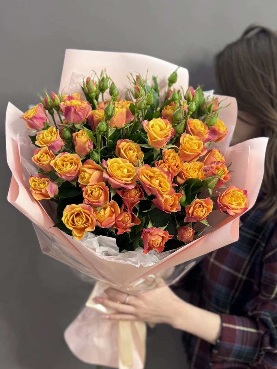 Букет из оранжевых кустовых роз сорта "Сонора"