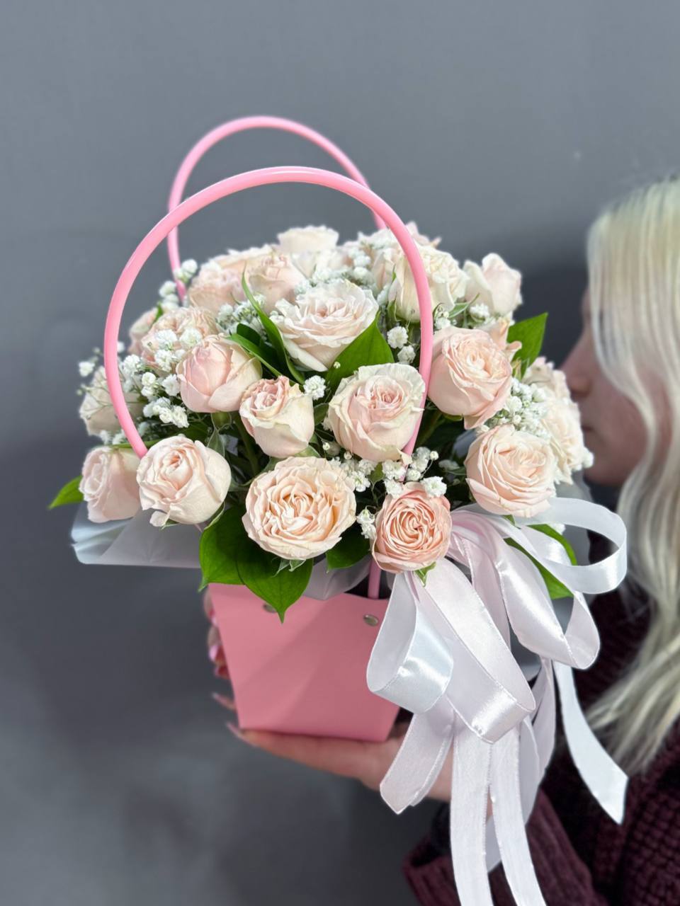 Сумочка с кустовыми пионовидными розами сорта "Bombastic"