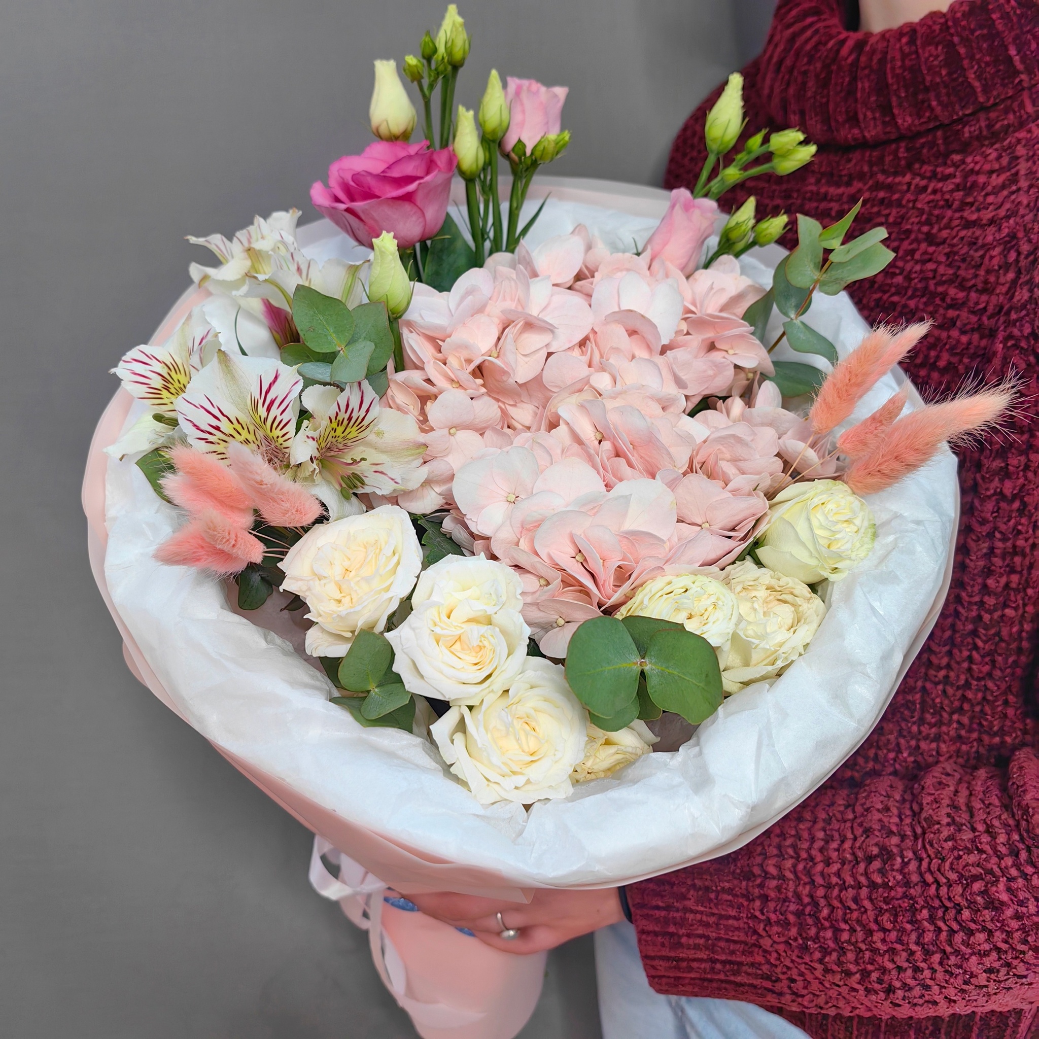 Авторский букет с розовой гортензией