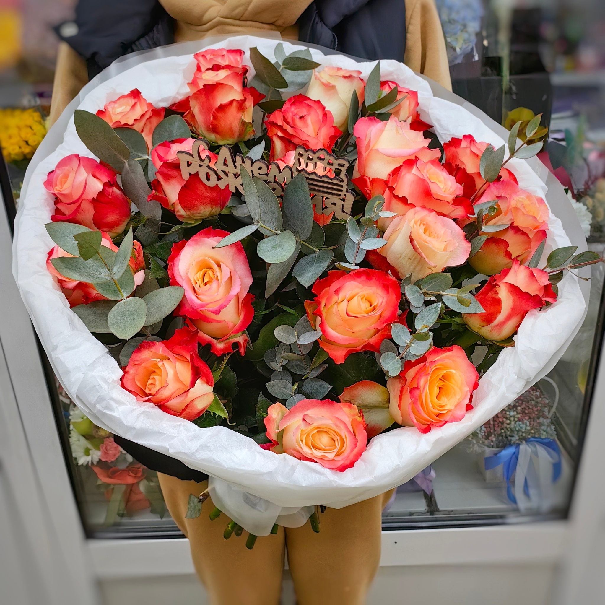 Букет из 21 розы сорта "Cabaret" с веточками эвкалипта