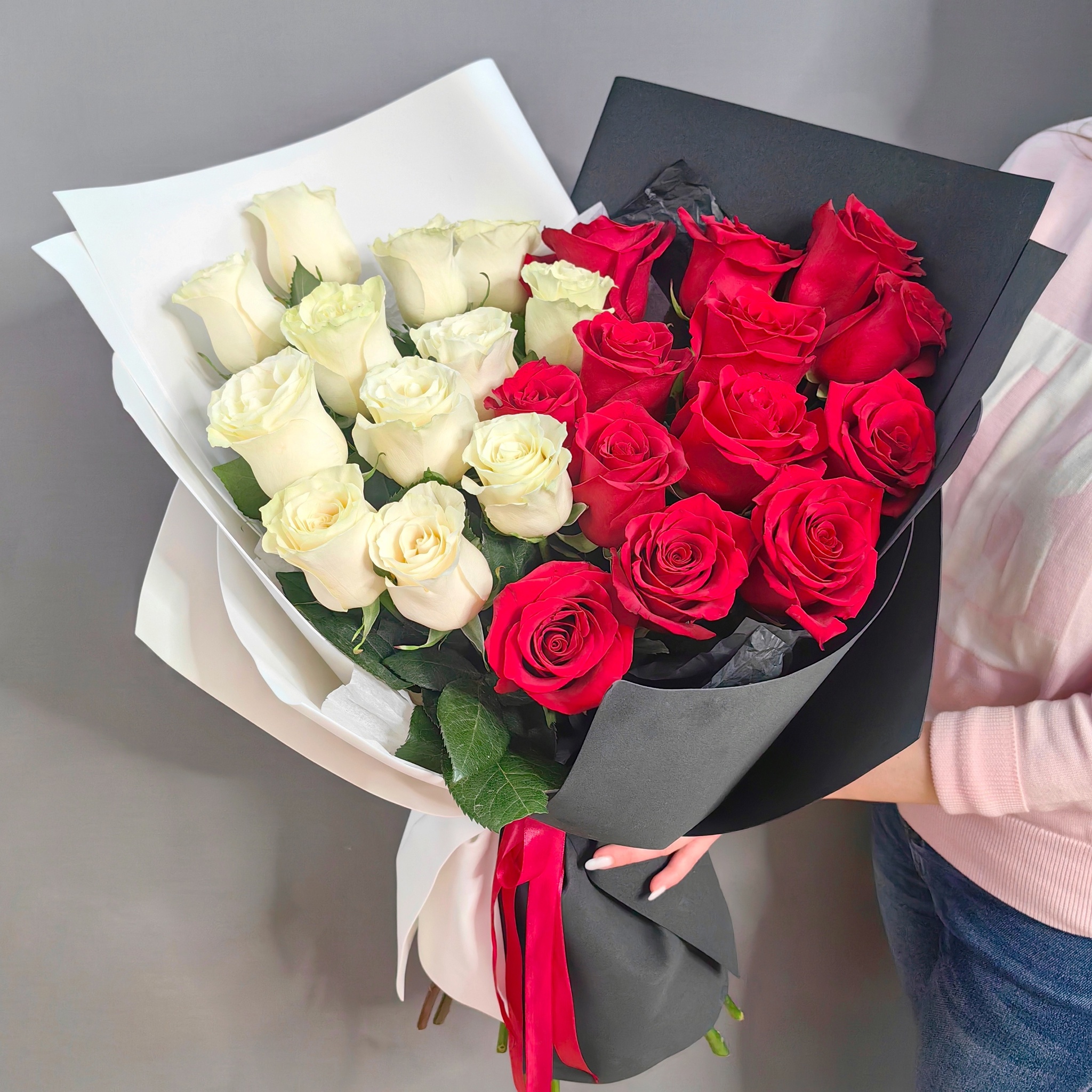 Букет из 25 белых и красных роз (Эквадор 60 см)