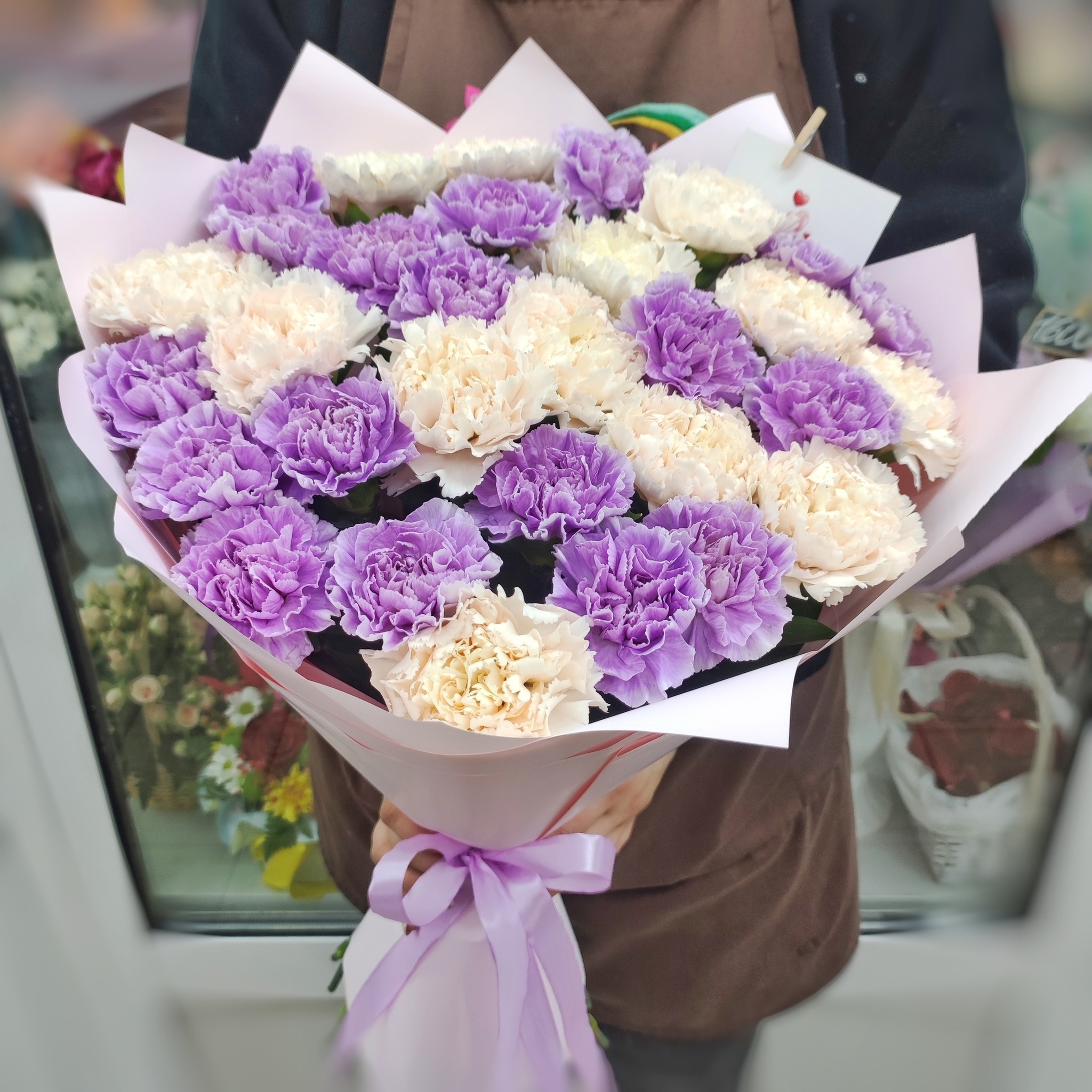 Букет из 31 кремовых и сиреневых диантусов