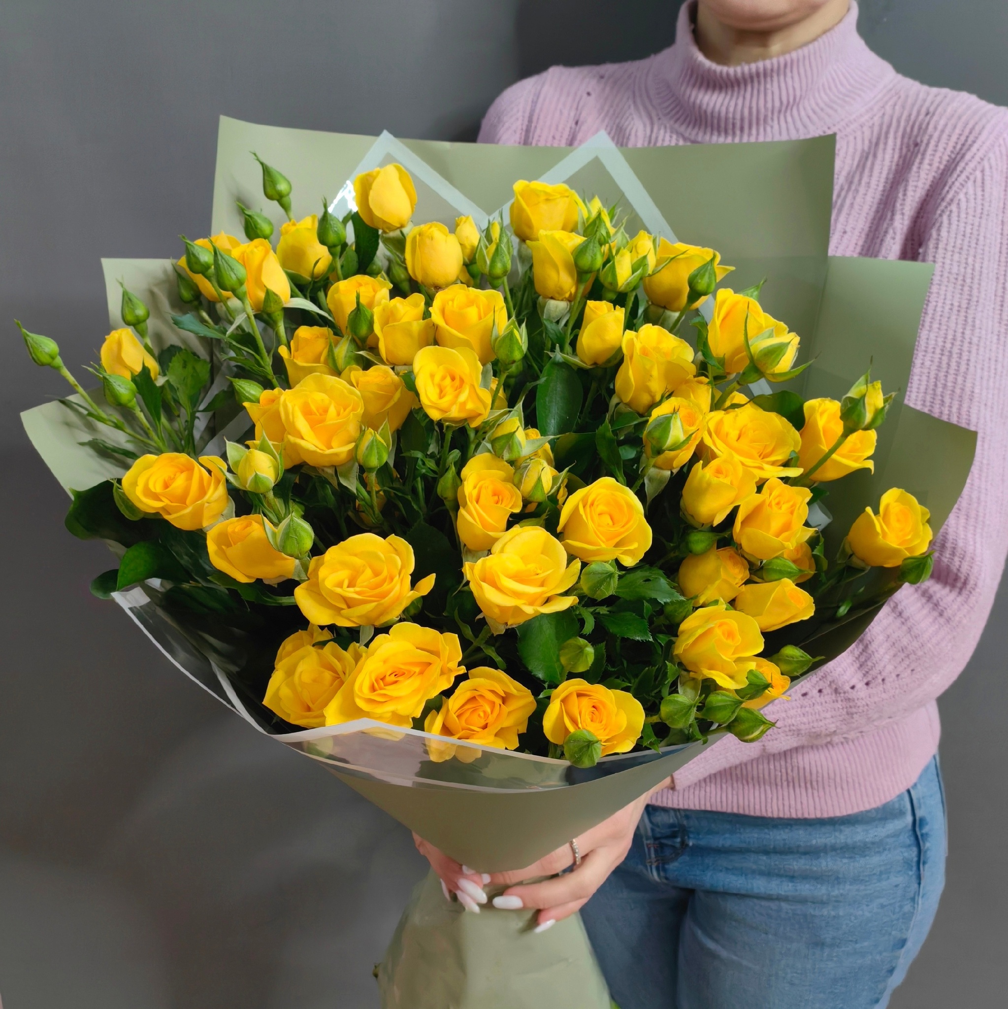 Букет из 9 желтых кустовых роз с веточками рускуса