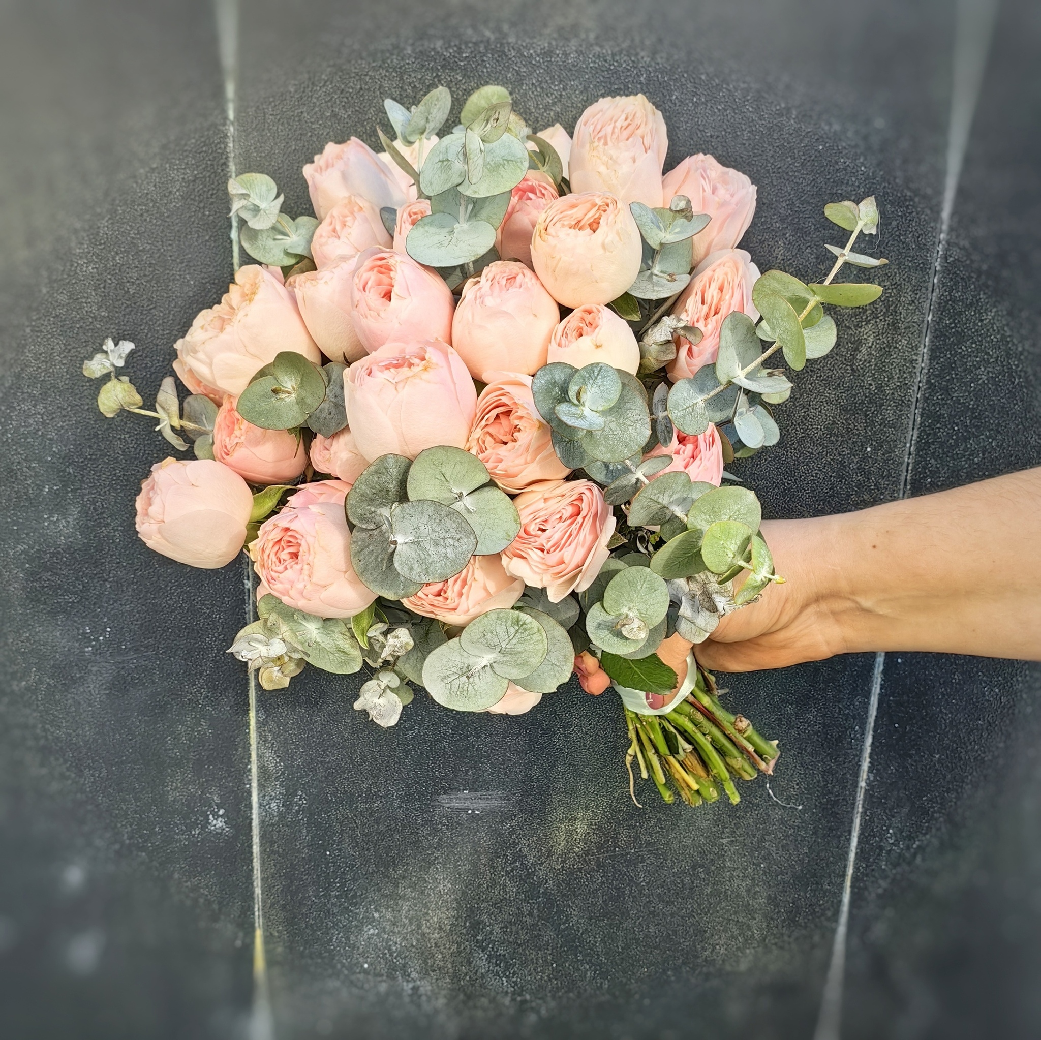 Букет невесты с кустовыми пионовидными розами "Mansfield park" и эвкалиптом