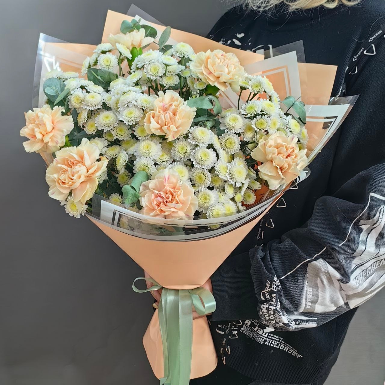 Букет с хризантемами сорта "STALION" и кремовыми диантусами