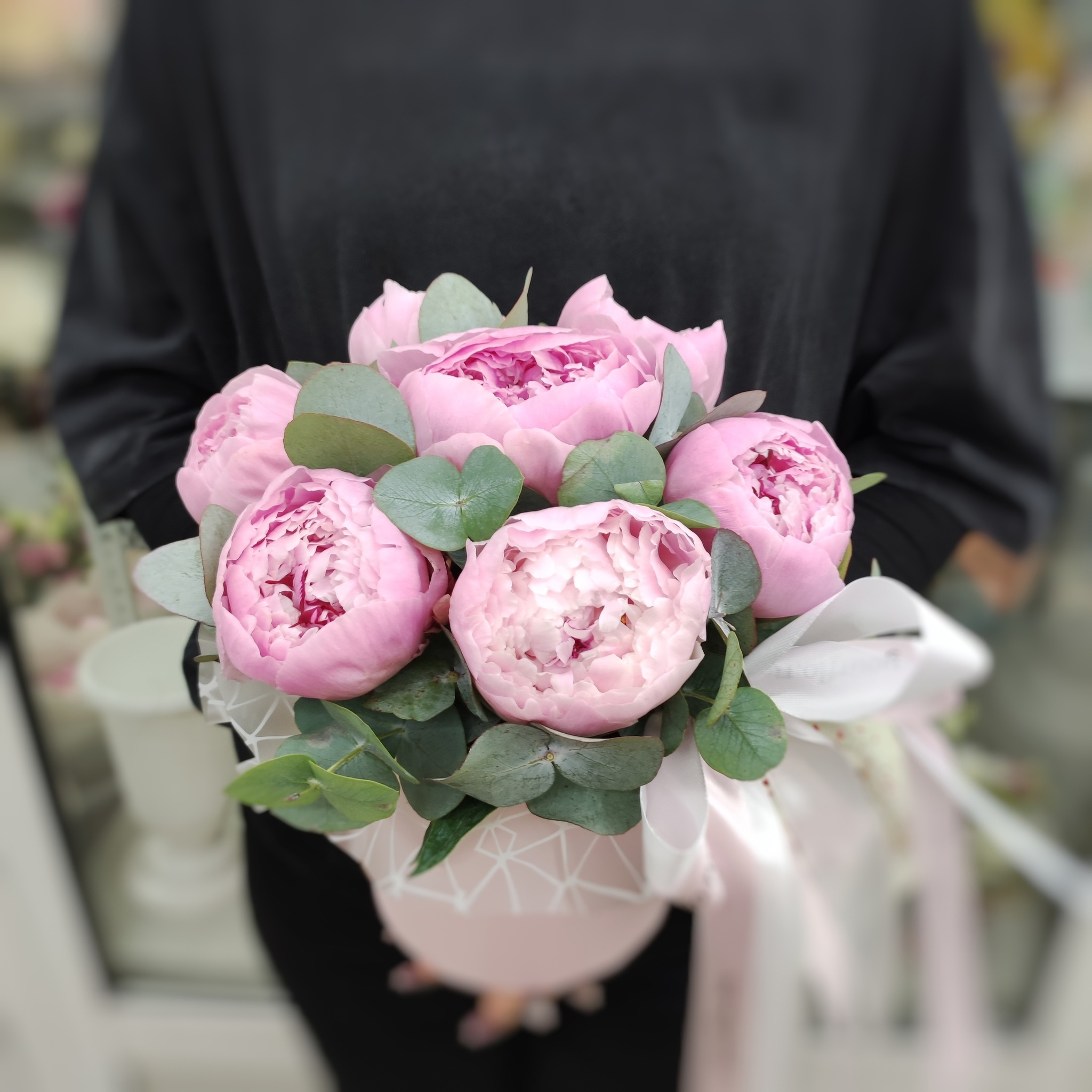 7 пионов сорта "Сара Бернар" с эвкалиптом в шляпной коробке