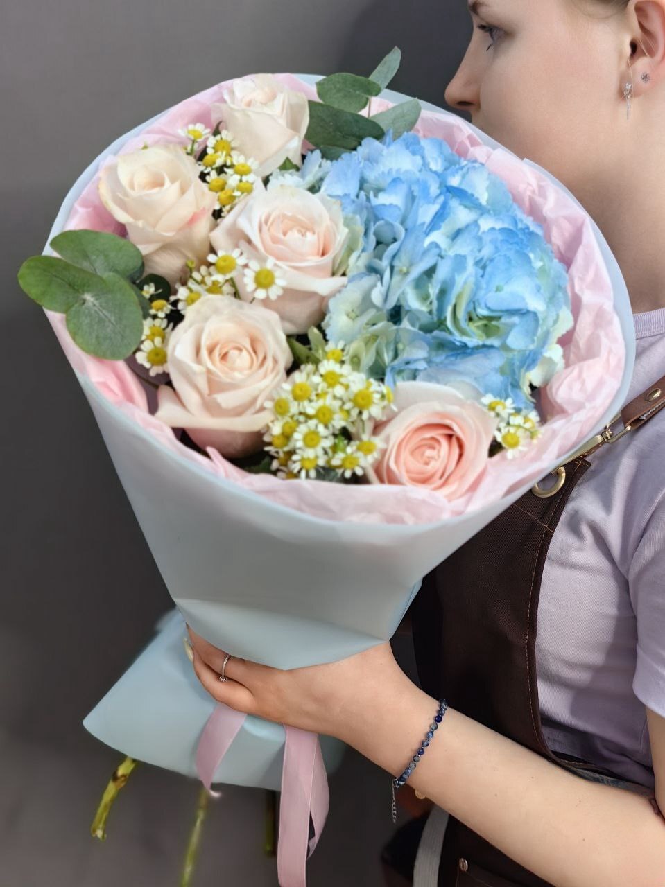 Авторский букет в розово-голубой гамме с гортензией