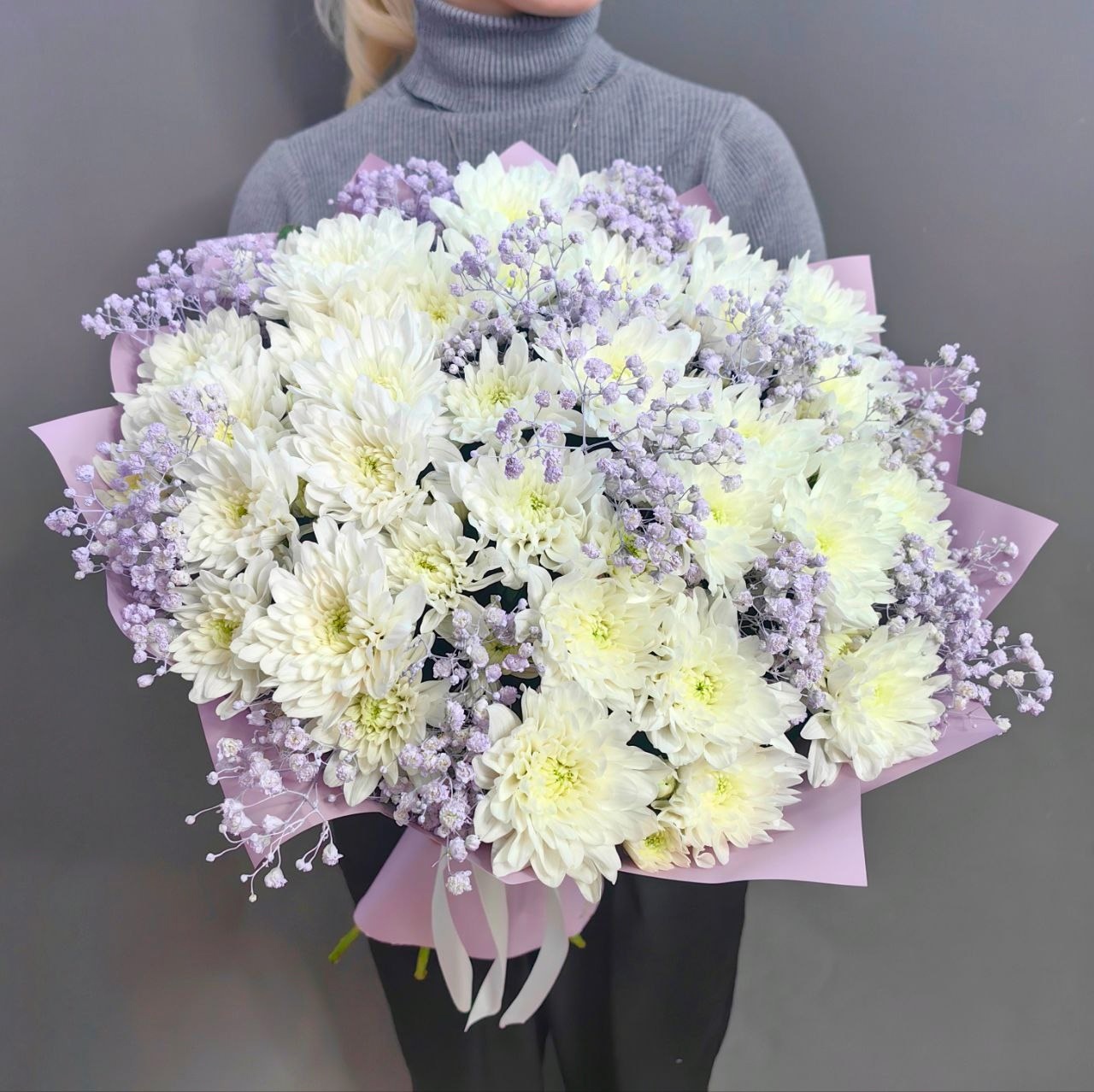 Букет из 9 кустовых хризантем сорта "Baltica white" и сиреневой гипсофилы