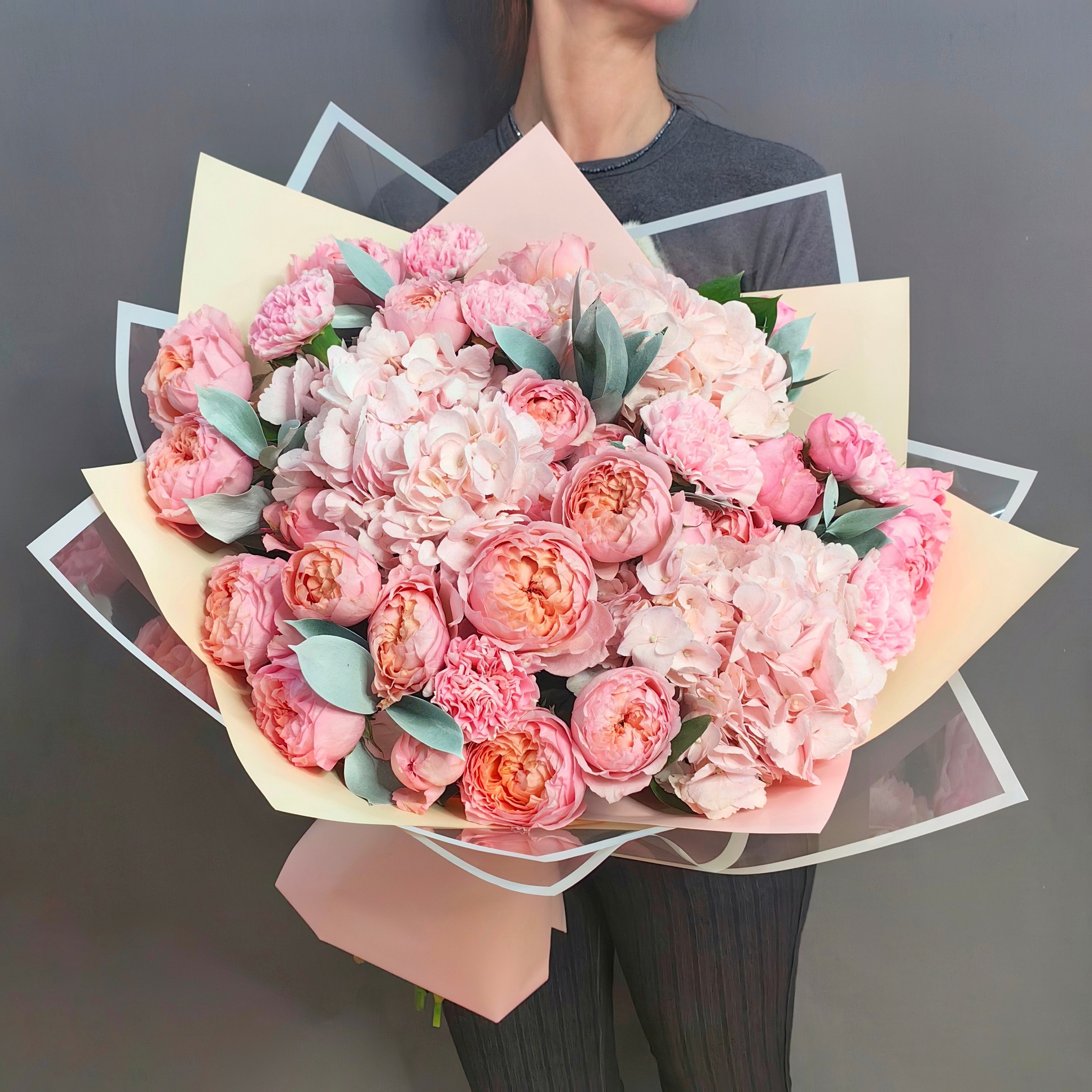 Авторский букет гортензиями и кустовыми пионовидными розами