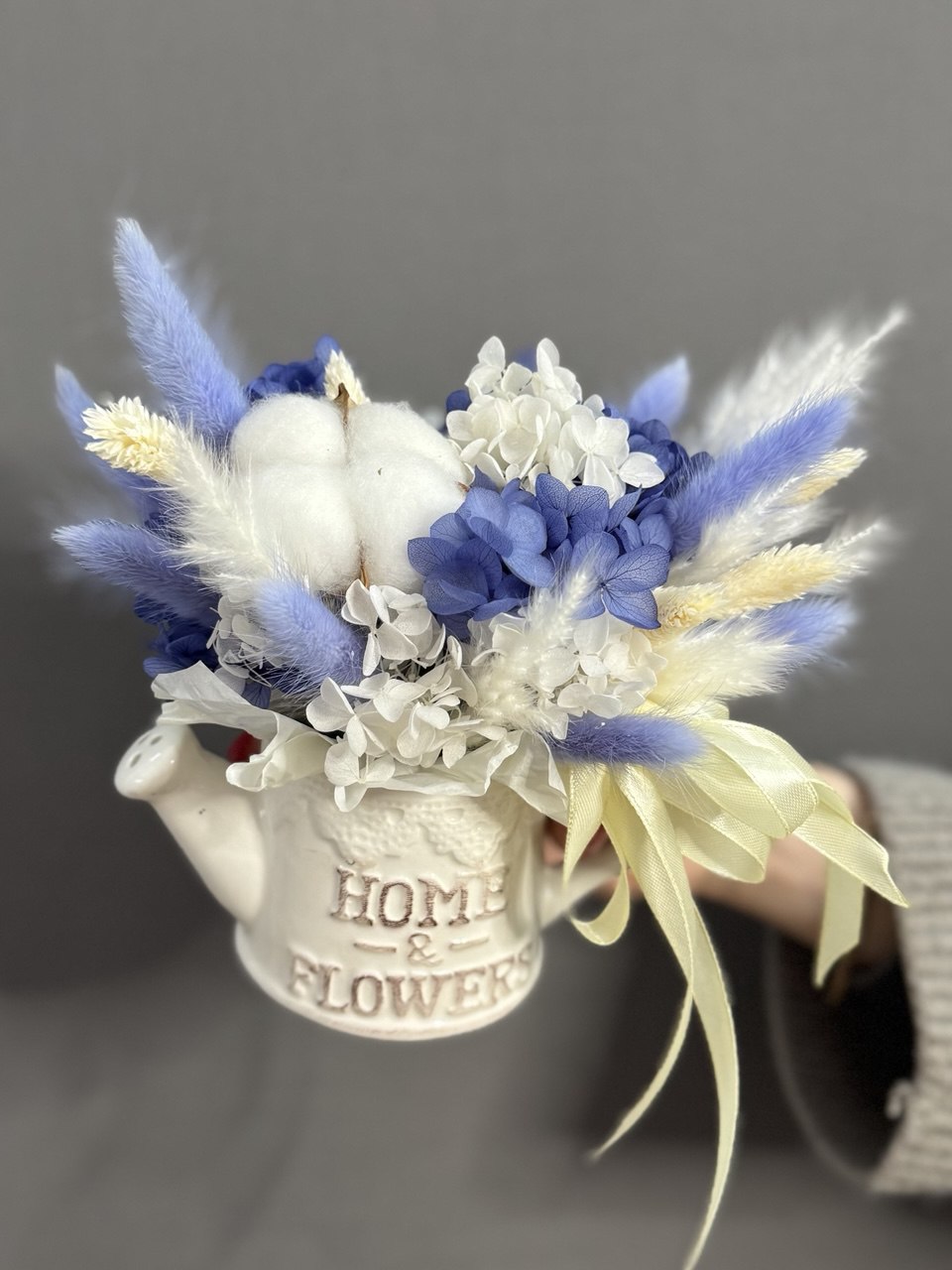 🏡💙Композиция из сухоцветов в белой лейке. Голубая гортензия, мягкий хлопок и солнечные кисточки лагуруса создают невероятно уютную и жизнерадостную атмосферу. Этот букет станет ярким акцентом в интерьере и напоминанием о том, что счастье начинается с дома.